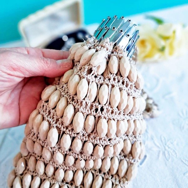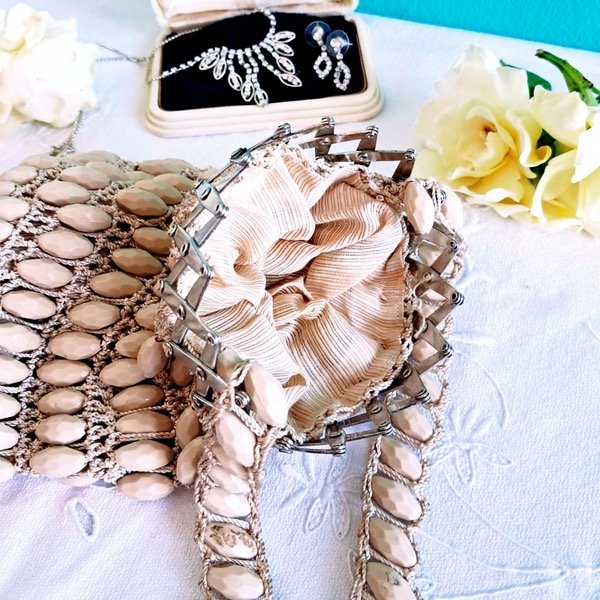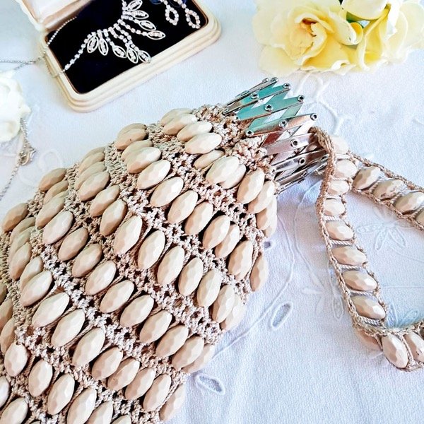 Hermosa cartería de los años 50, tejida con cuentas plásticas en color beige