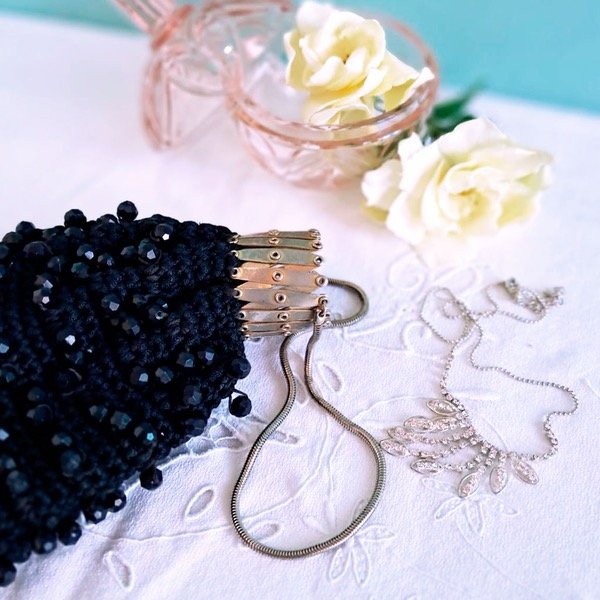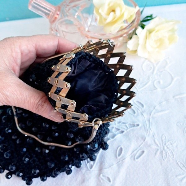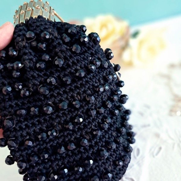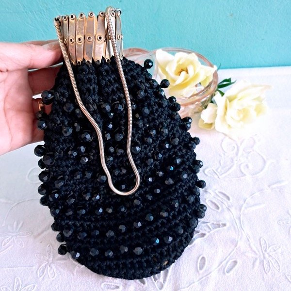 Tejida en hilo con cuentas plasticas, interior de satén y cadenita para colgar